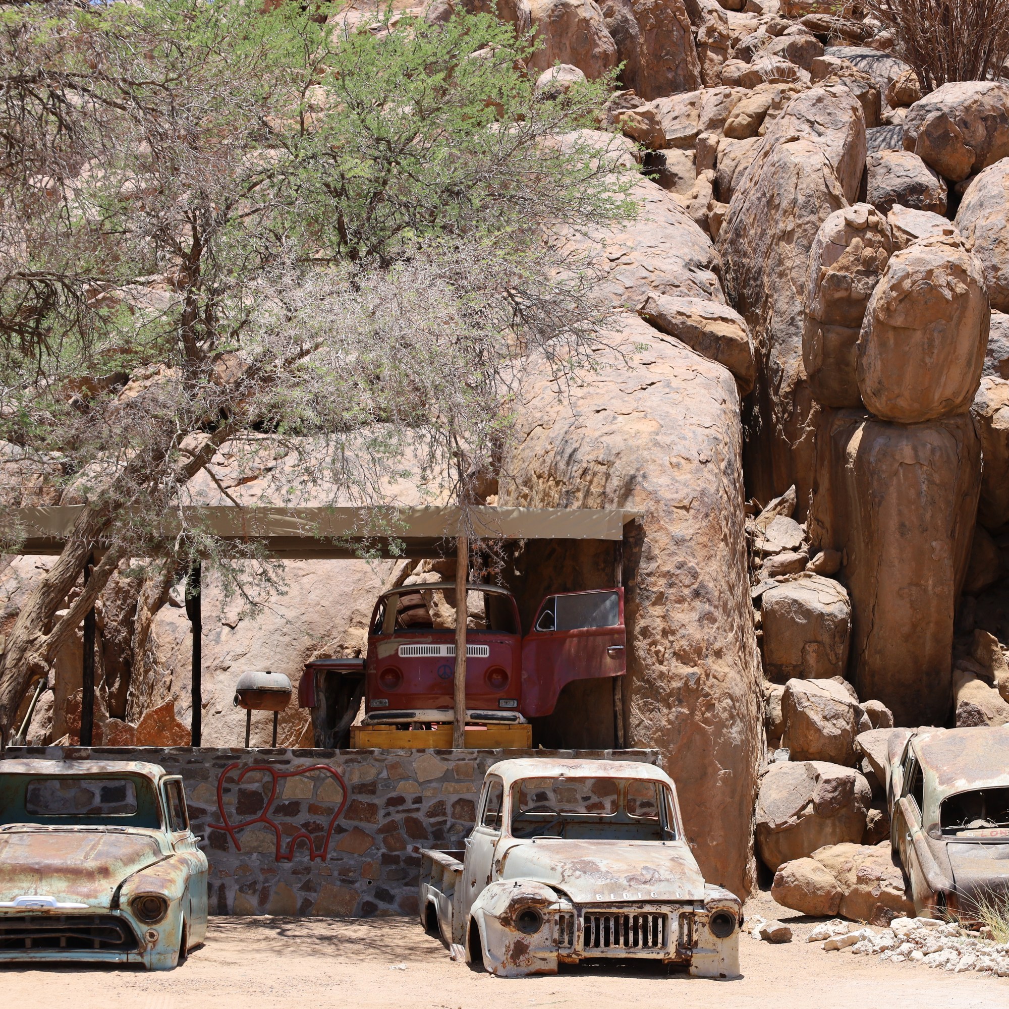 Entre Swakopmund et Sesriem au beau milieu du désert du Namib se trouve Solitaire. Il y deux choses là bas, la station essence datant des années 60 et ses carcasses de voitures aux allures de décor de cinéma et une boulangerie qui vend le célèbre crumble aux pommes Moose Mc Gregor réputé pour être la meilleure de Namibie. (Je confirme elle est excellente).