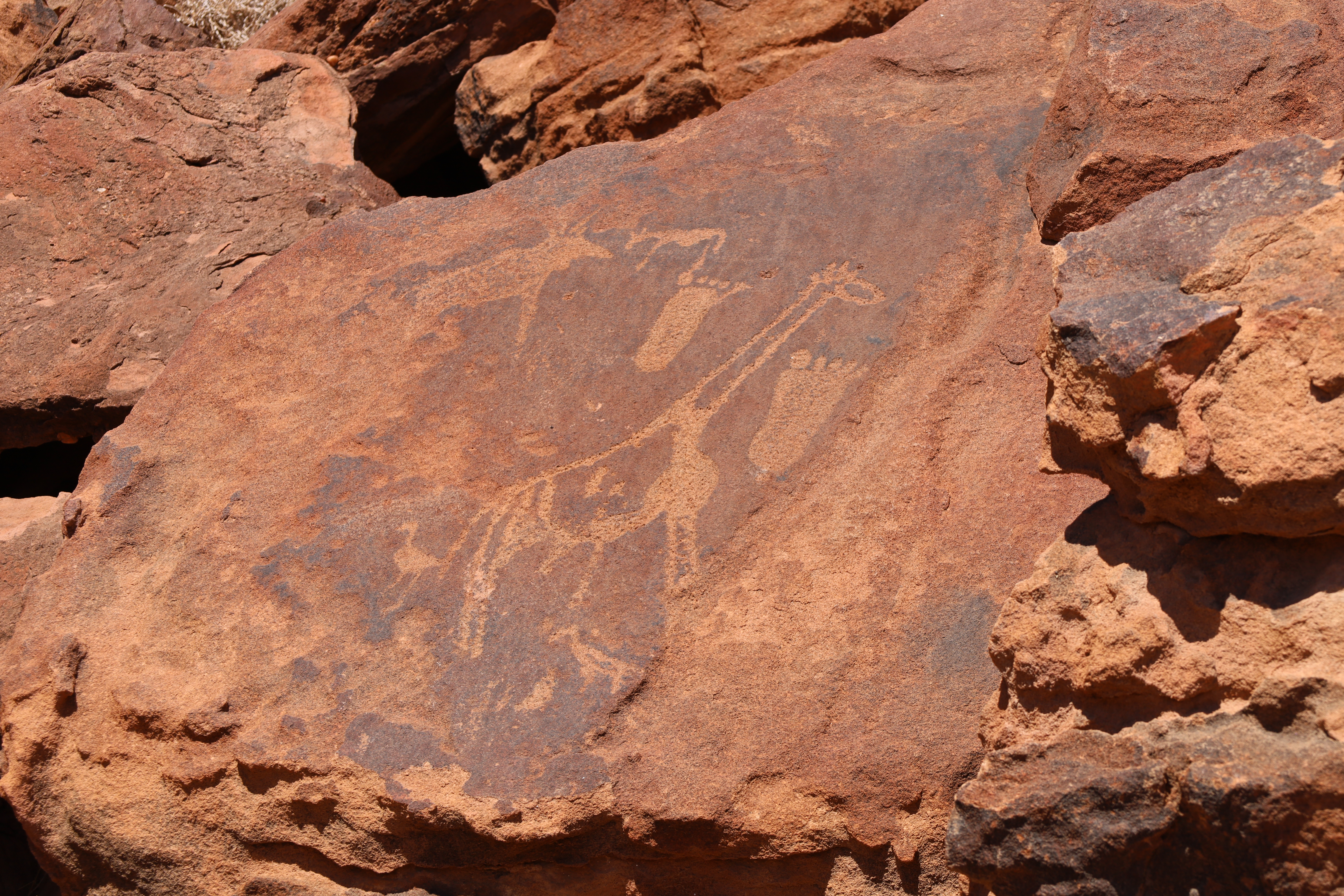 Dans l’après midi nous avons visité le site rupestre de Twyfelfontein, classé au patrimoine mondial de L’humanité par l’Unesco. Dans un vaste cirque montagneux, les hommes du Néolithique ont gravé dans le grès rouge près de 2 500 représentations animales, les plus anciens vestiges du continent africain.