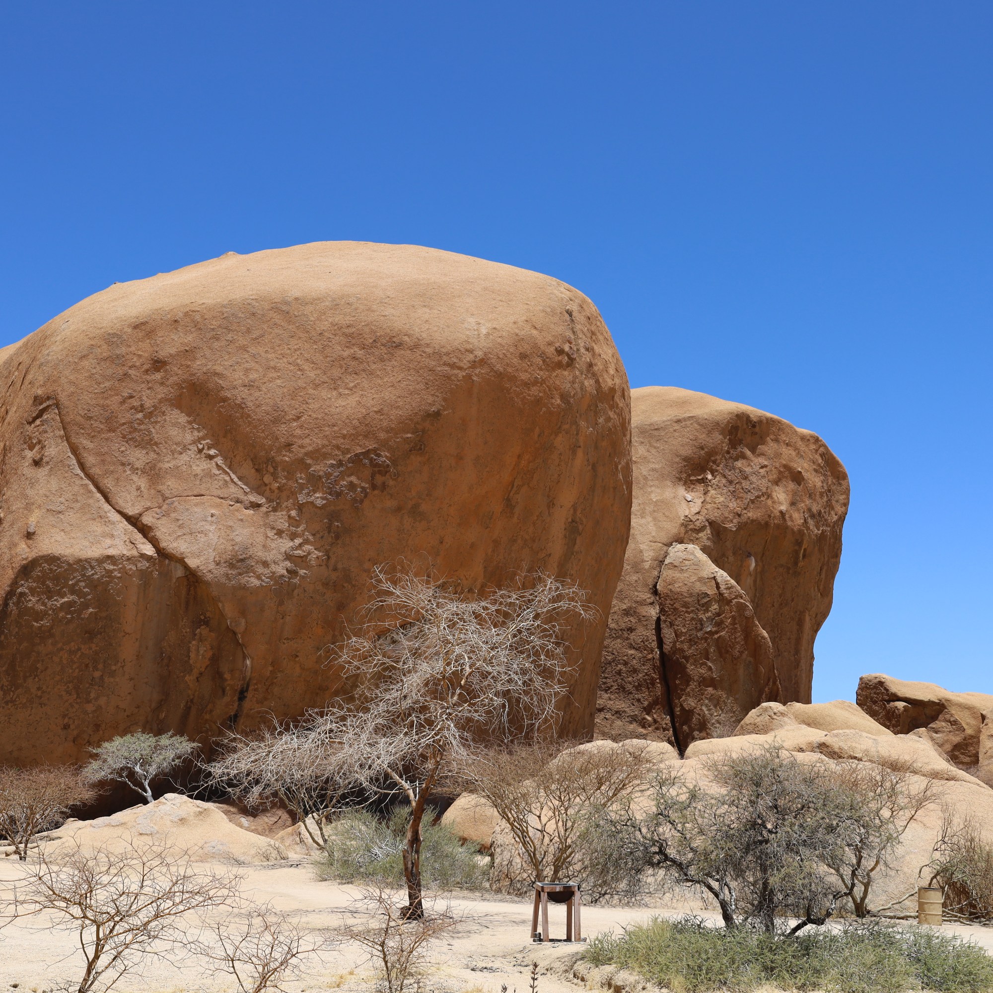 1h30 plus tard c’est partie pour environ 2h30 de route vers Spitzkoppe, monument géologique aux teintes orangées, le Groot Spizkoppe est une montagne de pierre culminant à 1784 mètres d’altitude dans la région du Damaraland, à l’ouest du pays.