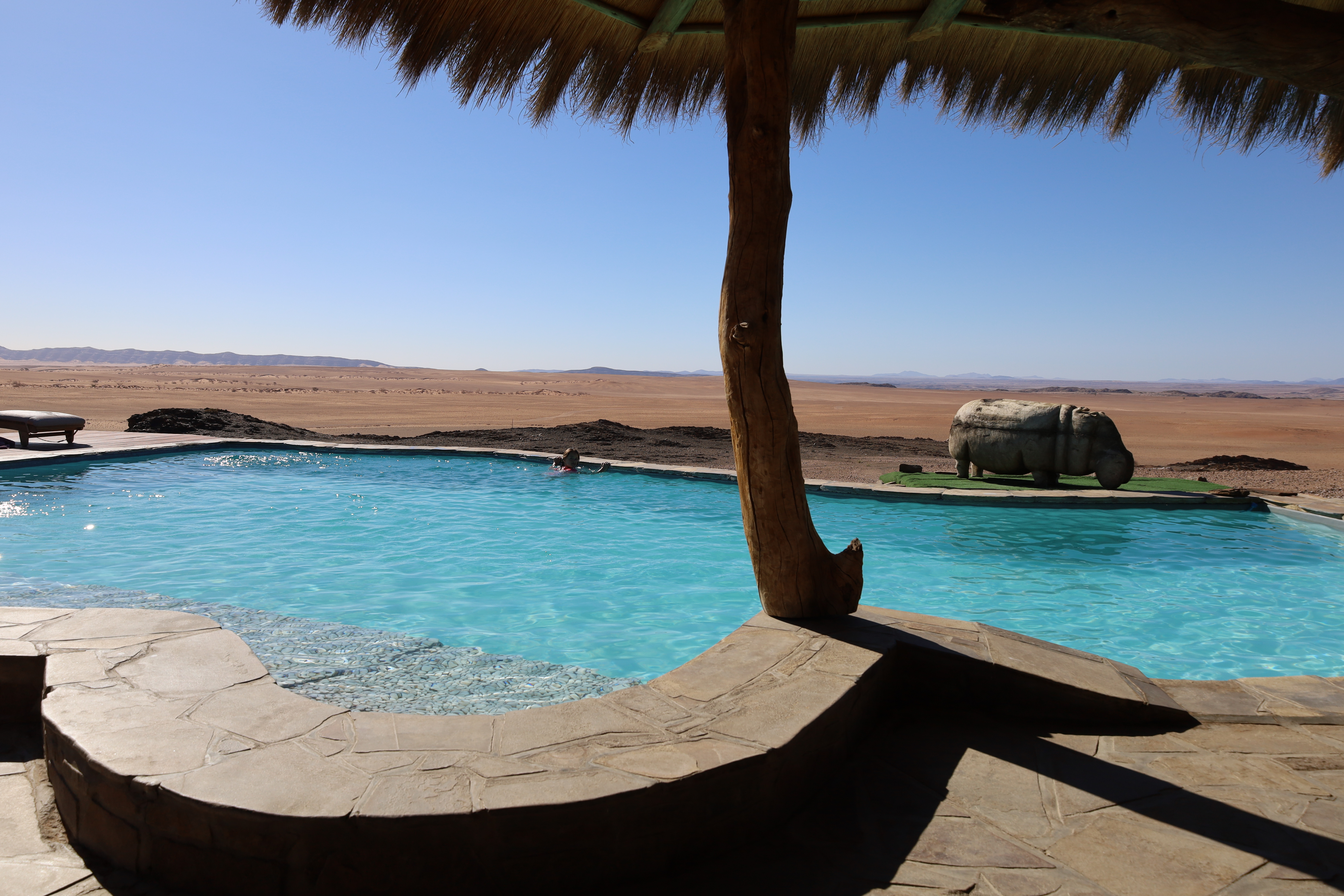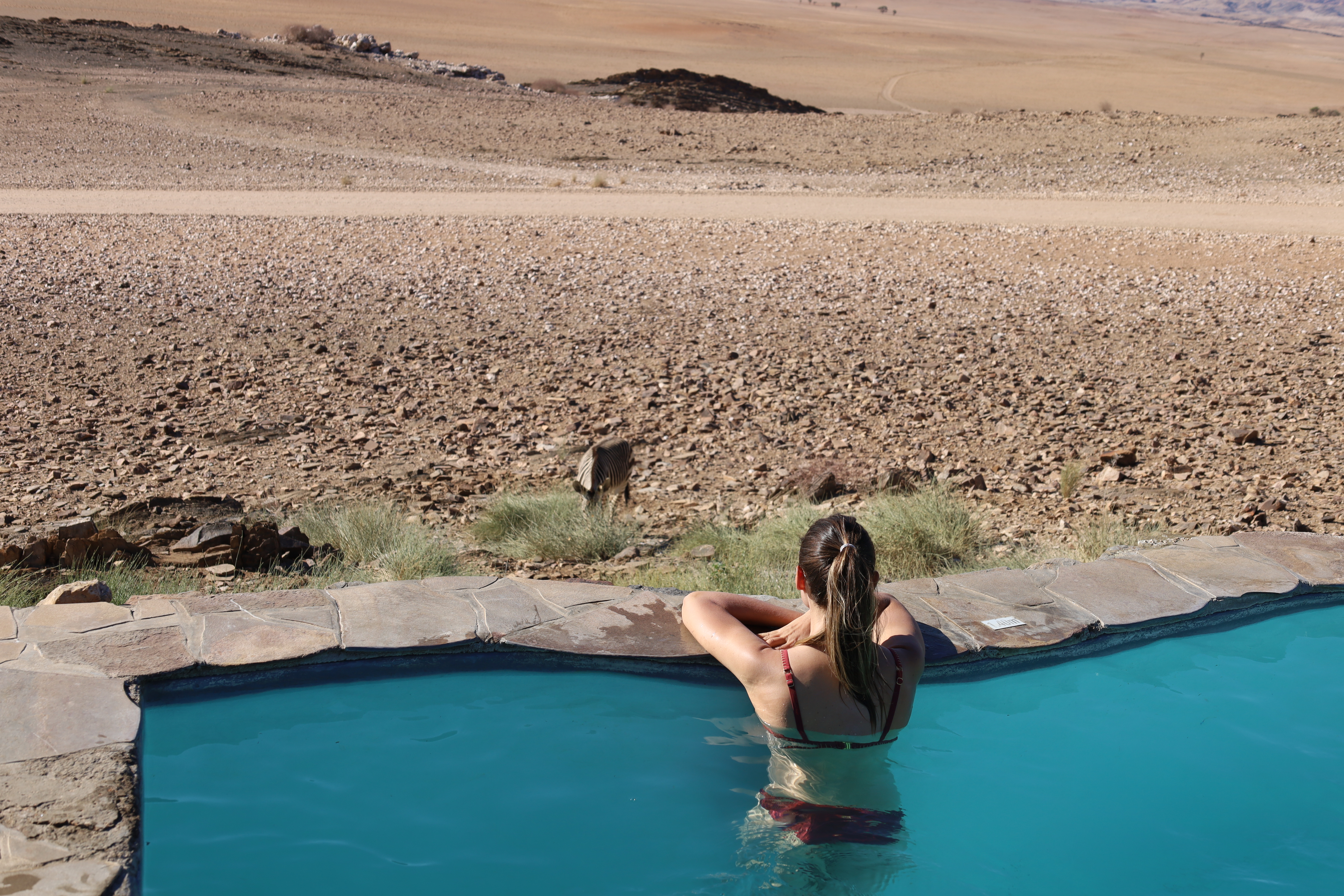 Fin de journée arrivée au Lodge pour une détente au bord de la piscine en pleins désert.